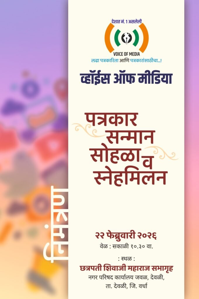 पत्रकारितेचे मुख्य उद्दिष्ट समजून घेणे, पत्रकारांचे संघटन अधिक मजबूत करणे आणि त्यांच्या कार्याची पावती म्हणून जिल्हयातील पत्रकारांचा सन्मान करण्यासाठी ‘व्हॉइस ऑफ मीडिया’ वर्धा जिल्ह्याच्या वतीने एका विशेष सोहळ्याचे आयोजन करण्यात आले आहे. हा ‘पत्रकार सन्मान व स्नेहमिलन सोहळा’ येत्या २२ फेब्रुवारी रोजी देवळी येथे संपन्न होणार आहे.